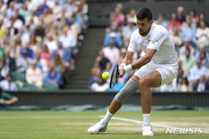 [런던=AP/뉴시스] 노바크 조코비치(2위·세르비아)가 12일(현지시각) 영국 런던의 올잉글랜드 클럽에서 열린 윔블던 테니스대회 남자 단식 준결승 로렌조 무세티(25위·이탈리아)와 경기하고 있다. 조코비치가 3-0(6-4 7-6 6-4) 완승을 거두고 결승에 올라 지난해에 이어 또다시 카를로스 알카라스(3위·스페인)와 우승을 다툰다. 2024.07.13.