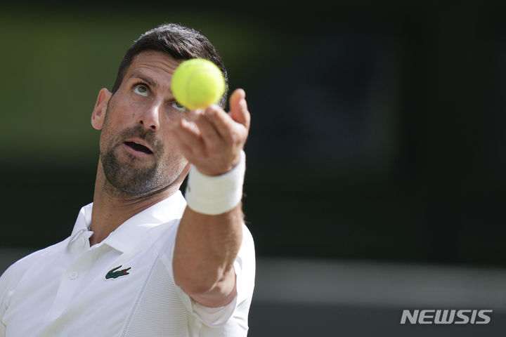 [런던=AP/뉴시스] 노바크 조코비치(2위·세르비아)가 12일(현지시각) 영국 런던의 올잉글랜드 클럽에서 열린 윔블던 테니스대회 남자 단식 준결승 로렌조 무세티(25위·이탈리아)와 경기하고 있다. 조코비치가 3-0(6-4 7-6 6-4) 완승을 거두고 결승에 올라 지난해에 이어 또다시 카를로스 알카라스(3위·스페인)와 우승을 다툰다. 2024.07.13.