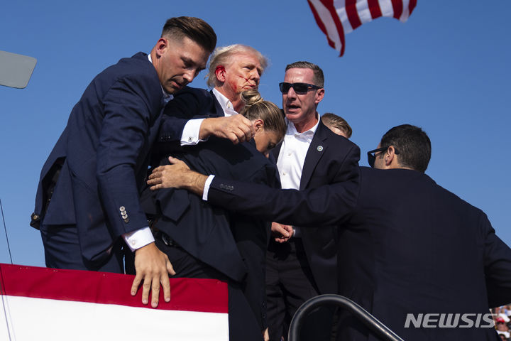 [버틀러(미 펜실베이니아주)=AP/뉴시스]도널드 트럼프 전 미 대통령이 13일(현지시각) 펜실베이니아주 버틀러에서 집회 도중 총격이 발생한 후 얼굴에 피가 묻은 모습으로 경호원들의 도움 속에 대피하고 있다. 미 사법 당국은 이 사건에 대해 트럼프 전 대통령에 대한 암살 시도로 조사하고 있다고 밝혔다. 2024.07.14.
