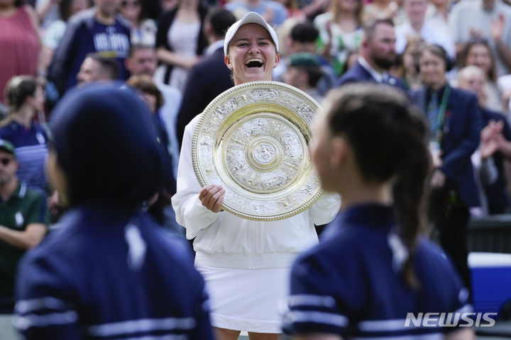 [런던=AP/뉴시스] 바르보라 크레이치코바(32위·체코)가 13일(현지시각) 영국 런던의 올잉글랜드 클럽에서 열린 윔블던 테니스대회 여자 단식 정상에 올라 트로피를 들고 포즈를 취하고 있다. 크레이치코바는 결승전에서 자스민 파올리니(7위·이탈리아)를 2-1(6-2 2-6 6-4)로 꺾고 윔블던 첫 우승을 차지했다. 2024.07.14.