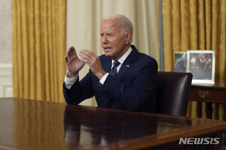 [워싱턴=AP/뉴시스] 조 바이든 미국 대통령이 14일(현지시각) 백악관 집무실에서 도널드 트럼프 전 대통령에 대한 암살 시도와 관련해 대국민 연설을 하고 있다. 2024.07.15.