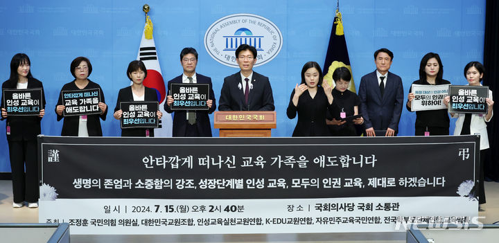 [서울=뉴시스] 조성우 기자 = 조정훈(왼쪽 다섯 번째) 국민의힘 의원이 15일 오후 서울 여의도 국회 소통관에서 대한민국교원조합, 전국학부모단체연합 회원들과 함께 교육가족 사망에 대한 공동추모 및 성명서 발표 기자회견을 하고 있다. 2024.07.15. [email protected]
