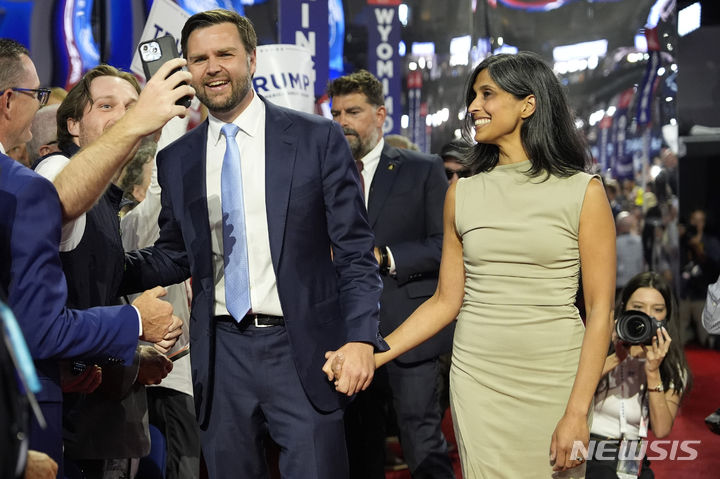 [밀워키=AP/뉴시스] 미국 공화당 부통령 후보인 JD 밴스 상원의원이 15일(현지시각) 부인 우샤와 함께 위스콘신주 밀워키의 파이서브포럼에서 열린 공화당 전당대회(RNC)에 도착하고 있다. 도널드 트럼프 전 대통령은 전당대회 첫날 밴스 의원을 본인의 러닝메이트로 지목, 발표했다. 2024.07.16.