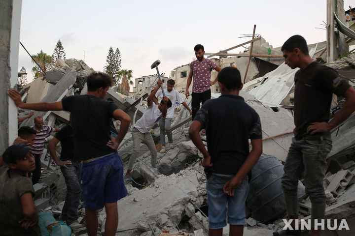 [가자지구=신화/뉴시스] 15일(현지시각) 가자지구 알마가지 난민촌 주민들이 이스라엘군의 공습으로 파괴된 건물 잔해를 정리하고 있다. 하마스 공보실은 가자지구 전체에서 지난 48시간 동안에 이스라엘군의 공격으로 320명의 팔레스타인 사상자가 발생했다고 발표했다. 2024.07.16.