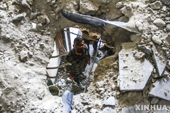 [가자지구=신화/뉴시스] 15일(현지시각) 가자지구 가자시티에서 팔레스타인 주민들이 이스라엘군의 공습으로 파괴된 건물의 피해 정도를 살피고 있다. 하마스 공보실은 가자지구 전체에서 지난 48시간 동안에 이스라엘군의 공격으로 320명의 팔레스타인 사상자가 발생했다고 발표했다. 2024.07.16.