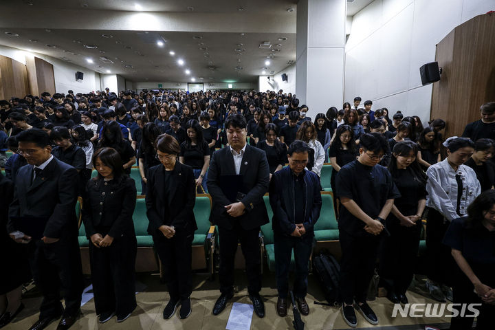[서울=뉴시스] 정병혁 기자 = 서이초 순직교사 1주기인 18일 서울 서초구 서울교육대학교에서 열린 교사유가족협의회, 초등교사노동조합 2024 순직교사 추모행사에서 참석자들이 묵념을 하고 있다. 2024.07.18. [email protected]