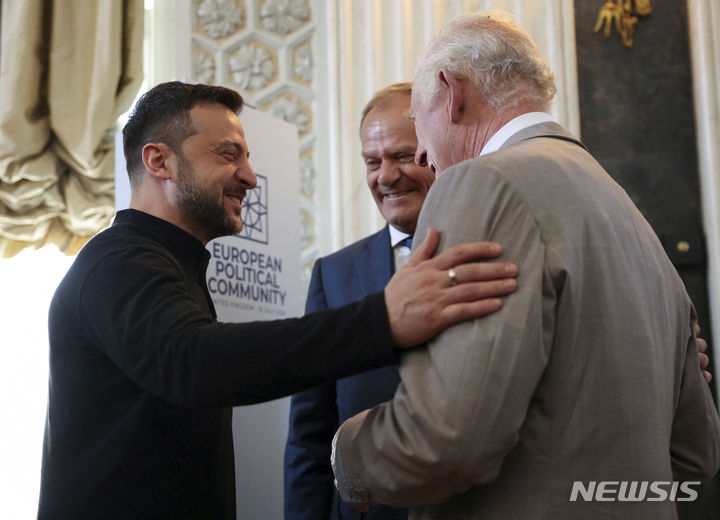[옥스퍼드셔=AP/뉴시스] 볼로디미르 젤렌스키(왼쪽) 우크라이나 대통령이 18일(현지시각) 영국 옥스퍼드셔 블레넘궁에서 열린 유럽정치공동체(EPC) 정상회의 동안 찰스 3세 영국 국왕을 만나 얘기를 나누고 있다. 찰스 3세 국왕은 이날 블레넘궁에서 환영식을 주최하고 각국 정상을 만나 대화했다. 2024.07.19.