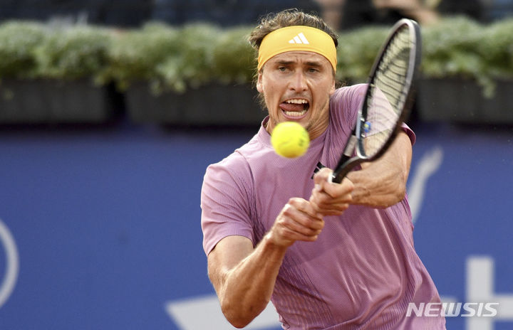 [함부르크=AP/뉴시스] 알렉산더 즈베레프(4위·독일)가 18일(현지시각) 독일 함부르크에서 열린 남자프로테니스(ATP) 투어 함부르크 오픈 단식 16강전에서 위고 가스통(81위·프랑스)과 경기하고 있다. 즈베레프가 2-1(4-6 6-2 7-5)로 역전승을 거두고 8강에 올랐다. 2024.07.19.