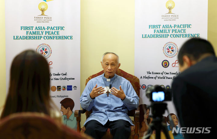 [마닐라(필리핀)=뉴시스] 홍효식 기자 = 안토니오 레데스마 카가얀데오로 가톨릭 명예 대주교가 '제1차 아시아-태평양 가정평화리더십 콘퍼런스'가 열린 19일(현지시각) 필리핀 마닐라 더 마닐라 호텔에서 한국 취재진과 인터뷰하고 있다. 2024.07.19. [email protected]