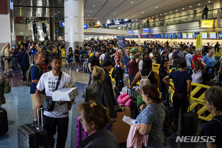 [라스베이거스=AP/뉴시스] 19일(현지시각) 미 네바다주 라스베이거스의 해리 리드 국제공항에서 통신 중단 문제로 항공편이 지연돼 탑승하지 못한 승객들이 터미널을 가득 메우고 있다. 마이크로소프트(MS)의 소프트웨어 업데이트 결함으로 전 세계 공항, 병원, 호텔 등에서 피해가 속출하는 IT대란이 발생했다. 2024.07.20.