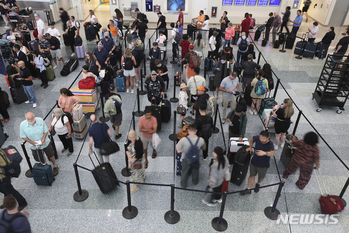 [미니애폴리스=AP/뉴시스] 19일(현지시각) 미 미네소타주 미니애폴리스의 세인트폴 국제공항에서 통신 중단 문제로 항공편이 지연돼 탑승하지 못한 승객들이 줄을 선 채 기다리고 있다. 마이크로소프트(MS)의 소프트웨어 업데이트 결함으로 전 세계 공항, 병원, 호텔 등에서 피해가 속출하는 IT 대란이 발생했다. 2024.07.20.
