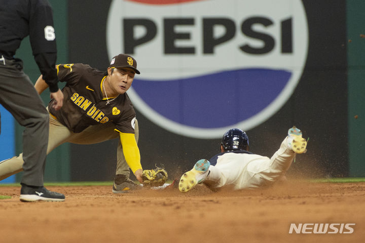 [샌디에이고=AP/뉴시스] 샌디에이고 파드리스 유격수 김하성이 19일(현지시각) 미 오하이오주 클리블랜드의 프로그레시브 필드에서 열린 2024 메이저리그 클리블랜드 가디언스와의 경기 6회 말 도루 수비를 하고 있다. 김하성은 2타수 무안타 1볼넷을 기록했고 샌디에이고는 0-7로 패했다. 2024.07.20.