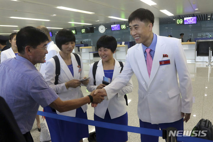 [평양=AP/뉴시스] 2024 파리 올림픽에 출전하는 북한 선수들이 20일 북한 평양공항에서 출국하면서 환송객과 인사를 나누고 있다. 북한은 8년 만에 하계 올림픽에 참가한다. 2024.07.21.