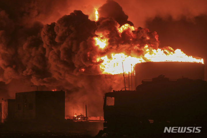 [호데이다=AP/뉴시스] 20일(현지시각) 예멘 홍해 항구도시 호데이다에 있는 유류 저장시설에서 불길이 치솟고 있다. 이스라엘군은 최근 이어진 후티 반군의 공격으로 자국민이 사상한 것에 대한 보복으로 이날 호데이다의 군사 목표물을 타격했다고 밝혔다. 2024.07.21.
