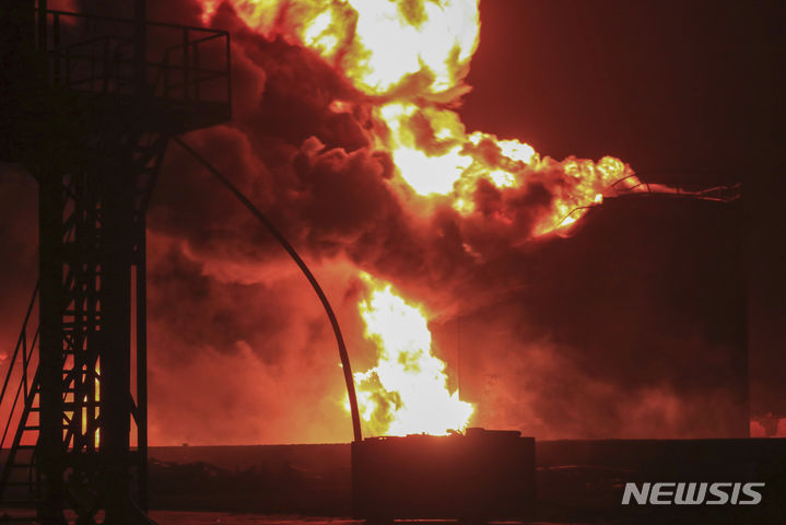 [호데이다=AP/뉴시스] 20일(현지시각) 예멘 홍해 항구도시 호데이다에 있는 유류 저장시설에서 불길이 치솟고 있다. 이스라엘군은 최근 이어진 후티 반군의 공격으로 자국민이 사상한 것에 대한 보복으로 이날 호데이다의 군사 목표물을 타격했다고 밝혔다. 2024.07.21.