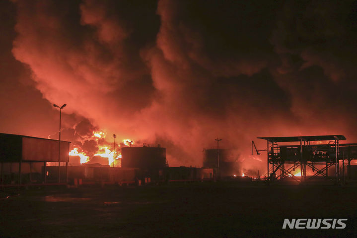 [호데이다=AP/뉴시스] 20일(현지시각) 예멘 홍해 항구도시 호데이다에 있는 유류 저장시설에서 불길이 치솟고 있다. 이스라엘군은 최근 이어진 후티 반군의 공격으로 자국민이 사상한 것에 대한 보복으로 이날 호데이다의 군사 목표물을 타격했다고 밝혔다. 2024.07.21.