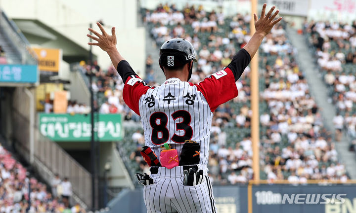 [서울=뉴시스] 추상철 기자 = 21일 오후 서울 송파구 잠실야구장에서 열린 2024 KBO리그 두산 베어스와 LG 트윈스의 경기, 2회말 1사 주자2루 상황에서 LG 정수성 코치가 작전지시를 하고 있다. 2024.07.21. [email protected]