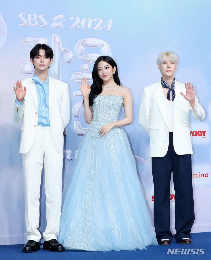 [인천=뉴시스] 김혜진 기자 = 가수 연준(왼쪽부터), 유진, 도영이 21일 오후 인천 중구 인스파이어아레나 리조트에서 열린 2024 SBS가요대전 서머 블루카펫에서 포즈를 취하고 있다. 2024.07.21. [email protected]