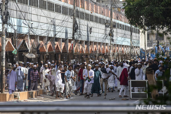 [다카=AP/뉴시스] 지난 19일(현지시각) 방글라데시 다카에서 공무원 일자리 할당제 폐지를 요구하는 시위대가 경찰과 대치하고 있다. 방글라데시 정부는 보수가 높은 정부 일자리 30%를 독립전쟁 참전용사 후손에게 할당하는 제도의 폐지를 요구하는 대학생들의 시위가 이어지고 많은 사상자가 발생하자 21일 독립 유공자 후손 우선 할당 비중을 대폭 축소하기로 했다. 2024.07.22.