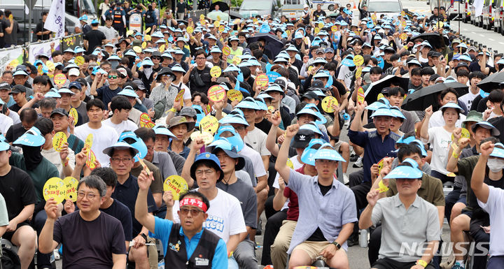 [세종=뉴시스] 강종민 기자 = 전국철도노조가 22일 세종시 정부세종청사 기획재정부 앞에서 서울지방본부 결의대회를 열고 성과급 지급기준 합의이행과 외주·인력감축 중단, 안전인력 충원 등을 촉구하고 있다. 2024.07.22. [email protected]