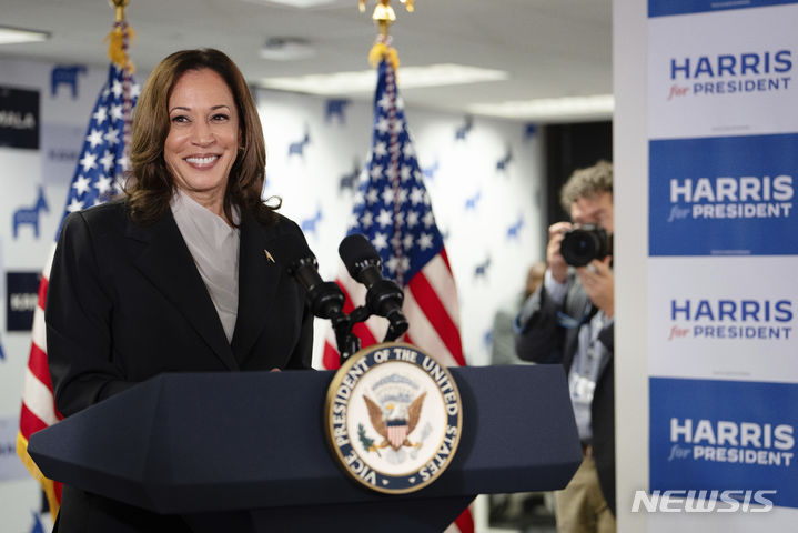 [윌밍턴=AP/뉴시스] 카멀라 해리스 미국 부통령이 22일(현지시각) 델라웨어주 윌밍턴에 있는 선거운동본부에서 연설하고 있다. 미국 민주당 유권자 10명 중 8명은 민주당 대선 후보로 해리스 부통령을 지지하는 것으로 나타났다. 2024.07.23.