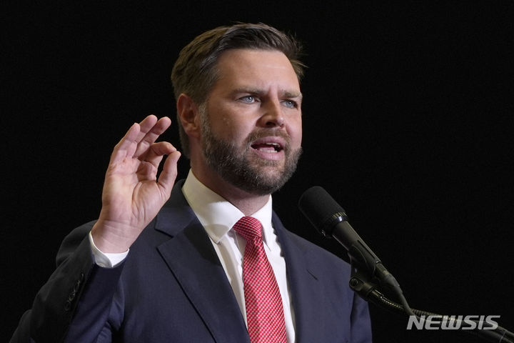 [래드포드=AP/뉴시스] 미국 공화당 부통령 후보인 JD 밴스 상원의원이 22일(현지시각) 버지니아주 래드포드 대학교에서 열린 유세 중 연설하고 있다. 밴스 의원은 앞선 오하이오주 미들타운 고등학교 유세에서 "민주당의 압박으로 조 바이든 대통령이 대선 후보직에서 사퇴한 것은 완전히 수치스러운 일"이라고 말했다. 2024.07.23.