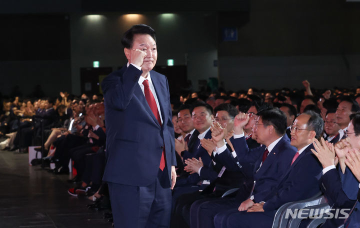 [고양=뉴시스] 조수정 기자 = 윤석열 대통령이 23일 경기 고양시 일산 킨텍스에서 열린 국민의힘 제4차 전당대회에서 황우여 비상대책위원장의 발언에 일어나 주먹을 쥐어 보이고 있다. 2024.07.23. [email protected]