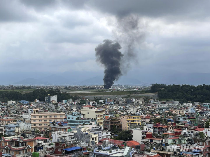 [카트만두=AP/뉴시스] 24일(현지시각) 네팔 카트만두의 트리부반 국제공항에서 연기가 피어오르고 있다. 현지 당국은 승객과 승무원 19명을 태우고 포카라로 향하던 사우리아 항공 소속 항공기가 이륙 중 활주로에서 미끄러져 불이 붙었다고 전했다. 정확한 인명 피해 여부는 아직 알려지지 않았다. 2024.07.24.
