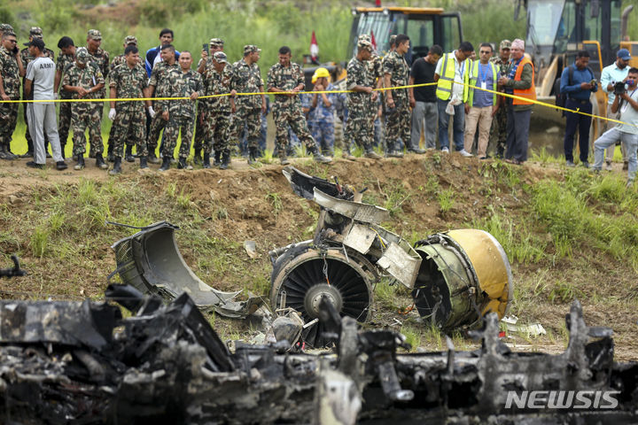 [카트만두=AP/뉴시스] 24일(현지시각) 네팔 카트만두의 트리부반 국제공항 항공기 사고 현장에 네팔 군인들이 모여 있다. 현지 당국은 승객과 승무원 19명을 태우고 포카라로 향하던 사우리아 항공 소속 CRJ-200 소형 여객기가 이륙 중 활주로에서 미끄러져 이탈한 후 불이 붙었다고 전했다. 이 사고로 18명이 숨지고 조종사만 살아남아 병원에서 치료를 받고 있다. 2024.07.24.