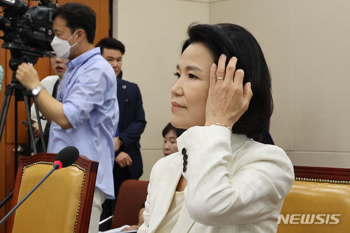 [서울=뉴시스] 권창회 기자 = 이진숙 방송통신위원회 위원장 후보자가 24일 오전 서울 여의도 국회에서 열린 과학기술정보방송통신위원회 전체회의 인사청문회에서 머리를 넘기고 있다. 2024.07.24. [email protected]