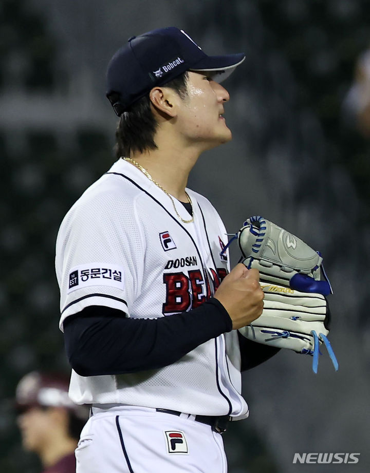 [서울=뉴시스] 홍효식 기자 = 24일 서울 송파구 잠실야구장에서 열린 2024 KBO리그 키움 히어로즈와 두산 베어스의 경기, 6회초 2사 1,2루 두산 선발투수 곽빈이 키움 이형종을 삼진아웃 시킨 뒤 주먹을 쥐고 있다. 2024.07.24. [email protected]