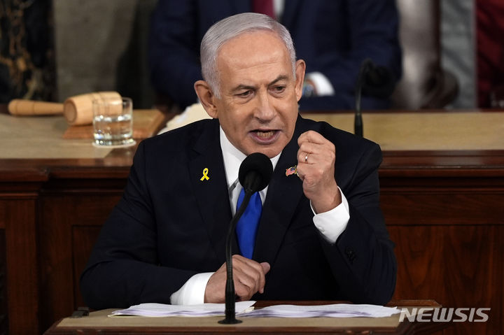 [워싱턴=AP/뉴시스] 베냐민 네타냐후 이스라엘 총리가 24일(현지시각) 미국 워싱턴DC 국회의사당에서 연설하고 있다. 네타냐후 총리는 가자 전쟁 반대 시위대를 “이란을 돕는 바보들”이라고 비난한 것으로 알려졌다. 이날 의사당 밖에서는 5000여 명의 팔레스타인 지지 시위대가 네타냐후 총리를 “전범” “학살 총리”라고 비난했다. 2024.07.25.