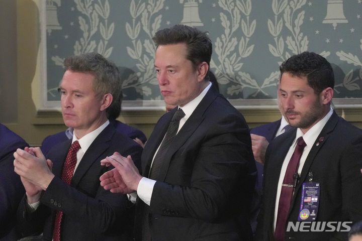 [워싱턴=AP/뉴시스] 일론 머스크(가운데) 테슬라 최고경영자(CEO)가 24일(현지시각) 미국 워싱턴DC 국회의사당에서 베냐민 네타냐후 이스라엘 총리의 연설에 기립 박수하고 있다. 네타냐후 총리는 가자 전쟁 반대 시위대를 “이란을 돕는 바보들”이라고 비난한 것으로 알려졌다. 이날 의사당 밖에서는 5000여 명의 팔레스타인 지지 시위대가 네타냐후 총리를 “전범” “학살 총리”라고 비난했다. 2024.07.25.