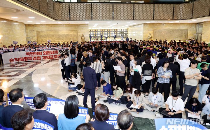 [서울=뉴시스] 조성봉 기자 = 25일 오후 서울 여의도 국회 로텐더홀에서 여야 의원들이 각각 '채해병 특검 찬성'과 '방송장악법 거부' 구호를 외치고 있다. 2024.07.25. [email protected]