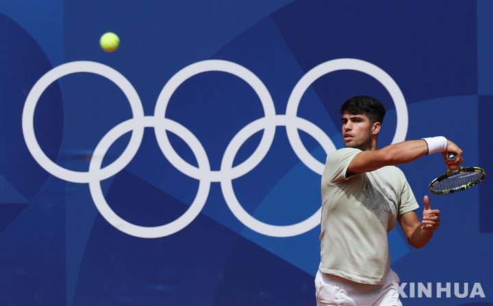 [파리=신화/뉴시스] 카를로스 알카라스(스페인)가 25일(현지시각) 프랑스 파리에서 열리는 2024 파리 올림픽에 앞서 훈련하고 있다. 알카라스는 단식은 물론 라파엘 나달(스페인)과 조를 이뤄 남자 복식에도 출전한다. 2024.07.26.
