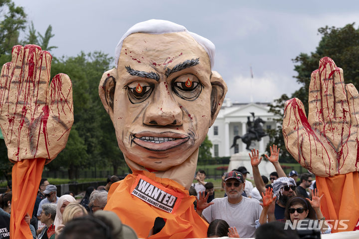 [워싱턴=AP/뉴시스] 25일(현지시각) 백악관 인근 라파예트 공원에서 시위대가 손에 피를 상징하는 붉은색 액체를 묻힌 베냐민 네타냐후 이스라엘 총리 형상의 허수아비를 들고 그의 백악관 방문에 항의하고 있다. 2024.07.26.