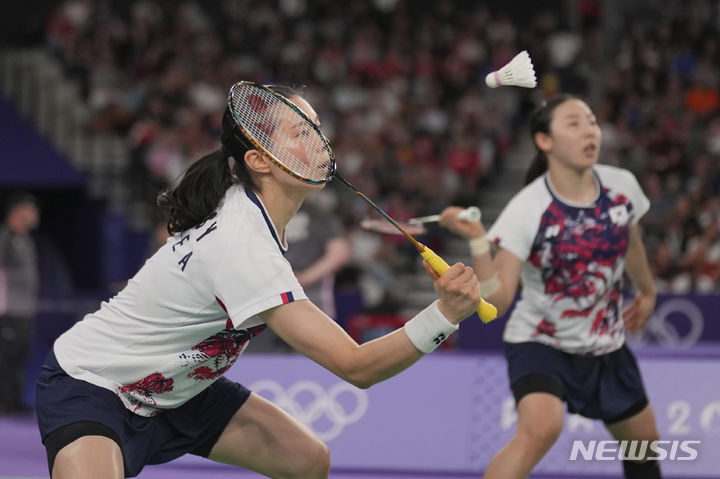 [파리=AP/뉴시스] 김소영-공희용 조(세계 8위)가 27일(현지시각) 프랑스 파리의 포르트드라샤펠 경기장에서 열린 2024 파리올림픽 배드민턴 여자복식 조별 예선 1차전에서 타니샤 크라스토-아쉬위니 포나파 조(세계 19위·인도)와 경기하고 있다. 김소영-공희용이 2-0(21-18 21-10)으로 승리하고 1승을 먼저 챙겼다. 복식 경기는 4개 팀이 한 조를 이뤄 예선을 치른 후 조 1, 2위가 8강에 오른다. 2024.07.28.