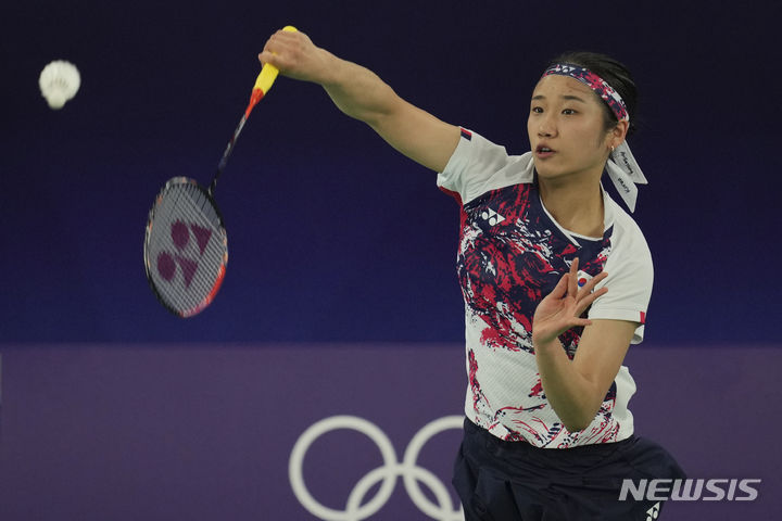 [파리=AP/뉴시스] 안세영이 28일(현지시각) 프랑스 파리 라 샤펠 아레나에서 열린 파리 올림픽 배드민턴 여자 단식 조별예선 불가리아 칼로야나 날반토바 선수와의 경기에서 공격을 시도하고 있다. 2024.07.29.