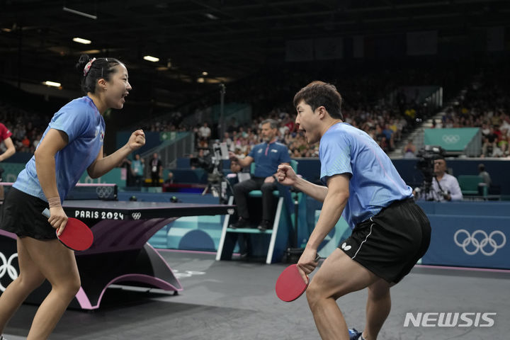 [파리=AP/뉴시스] 28일(현지시각) 프랑스 파리 사우스 파리 아레나에서 파리 올림픽 탁구 혼합 복식 8강전 한국과 루마니아의 경기에서 공격에 성공한 신유빈과 임종훈이 기뻐하고 있다. 2024.07.29.