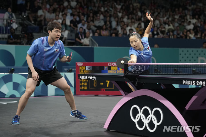 [파리=AP/뉴시스] 28일(현지시각) 프랑스 파리 사우스 파리 아레나에서 파리 올림픽 탁구 혼합 복식 8강전 한국과 루마니아의 경기에서 신유빈이 공격을 시도하고 있다. 2024.07.29.