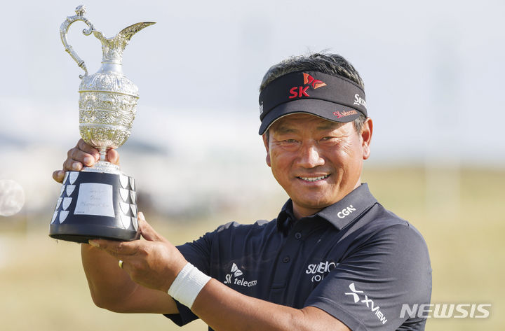 [커누스티=AP/뉴시스] 최경주가 28일(현지시각) 영국 스코틀랜드 커누스티의 커누스티 골프링크스에서 열린 미국프로골프(PGA) 투어 더 시니어 오픈 챔피언십 정상에 올라 트로피를 들고 입 맞추고 있다. 최경주는 최종 합계 10언더파 278타로 생애 첫 메이저대회 우승컵을 들어 올렸다. 2024.07.29.