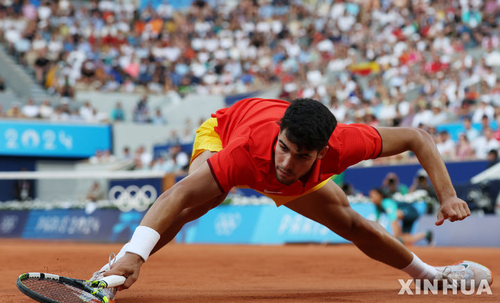 [파리=신화/뉴시스] 카를로스 알카라스(스페인)가 29일(현지시각) 프랑스 파리의 롤랑가로스 경기장에서 열린 2024 파리올림픽 테니스 남자 단식 2회전 경기에서 탈론 그리에크스푸르(네덜란드)와 경기하고 있다. 알카라스가 2-0(6-1 7-6)으로 승리하고 16강에 올랐다. 2024.07.30.