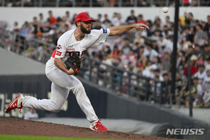 [광주=뉴시스] 박기웅 기자 = 10일 오후 광주 북구 광주-기아챔피언스필드에서 열린 2024 신한 SOL뱅크 KBO리그 KIA 타이거즈 대 두산 베어스의 경기, 3회 초 KIA 선발투수 알드레드가 역투하고 있다. 2024.07.30. [email protected]