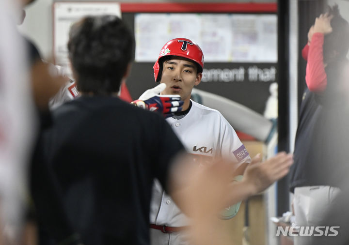 [광주=뉴시스] 박기웅 기자 = 30일 오후 광주 북구 광주-기아챔피언스필드에서 열린 2024 신한 SOL뱅크 KBO리그 KIA 타이거즈 대 두산 베어스의 경기, 8회말 대주자로 나갔던 KIA 홍종표가 득점을 올린 뒤 덕아웃으로 들어오고 있다. 2024.07.30. [email protected]