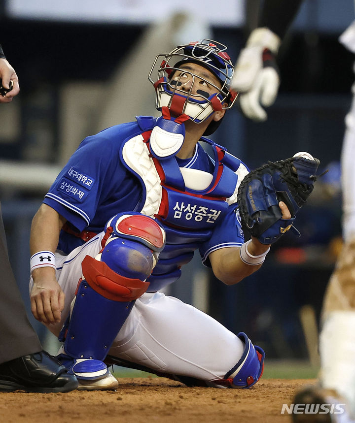 [서울=뉴시스] 정병혁 기자 = 30일 서울 송파구 잠실야구장에서 열린 2024 신한 SOL 뱅크 KBO리그 삼성 라이온즈와 LG 트윈스의 경기, 3회말 무사 주자 없는 상황 LG 홍창기 타석 때 삼성 포수 강민호가 포구를 한 뒤 심판을 바라보고 있다. 2024.07.30. [email protected]