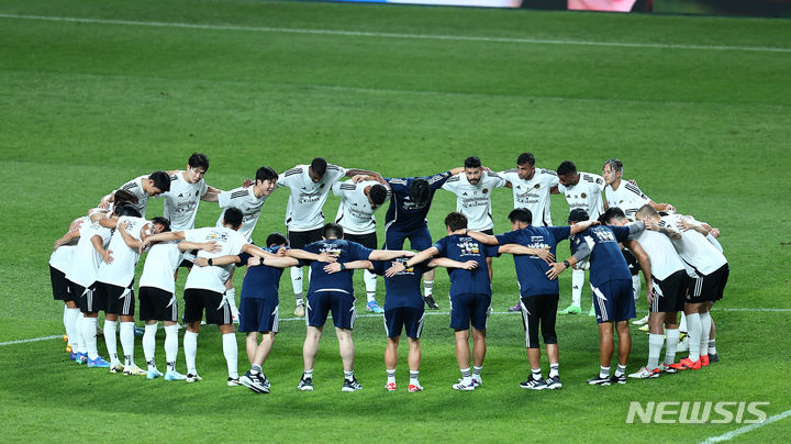 [서울=뉴시스] 김근수 기자 = 팀 K리그 선수들이 30일 오후 서울 마포구 상암월드컵 경기장에서 열린 쿠팡플레이 시리즈 1차전 팀 K리그 대 토트넘 홋스퍼 경기를 앞두고 열린 오픈 트레이닝에서 훈련을 마무리 하고 있다. 2024.07.30. [email protected]