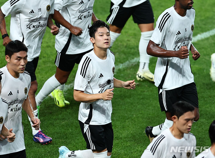[서울=뉴시스] 김근수 기자 = 팀 K리그 양민혁과 선수들이 30일 오후 서울 마포구 상암월드컵 경기장에서 열린 쿠팡플레이 시리즈 1차전 팀 K리그 대 토트넘 홋스퍼 경기를 앞두고 열린 오픈 트레이닝에서 훈련하고 있다. 2024.07.30. [email protected]