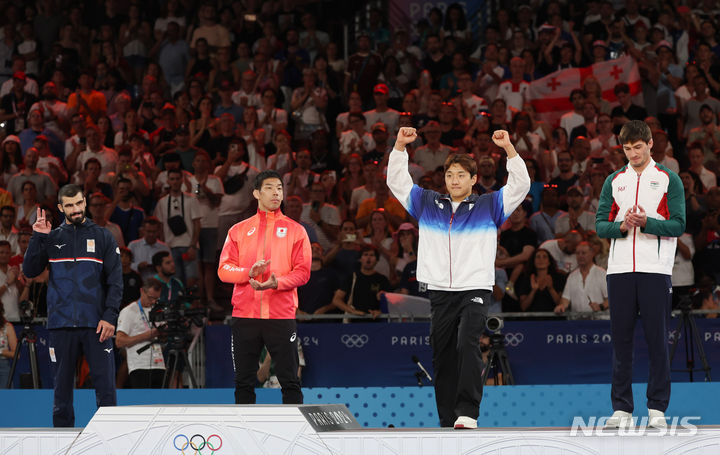 [파리=뉴시스] 김진아 기자 = 이준환이 30일(현지시각) 프랑스 파리 아레나 샹드마르스에서 열린 2024 파리 올림픽 유도 남자 81kg급 시상식에서 시상대에 오르며 팔을 들어올리고 있다. 2024.07.31. [email protected]