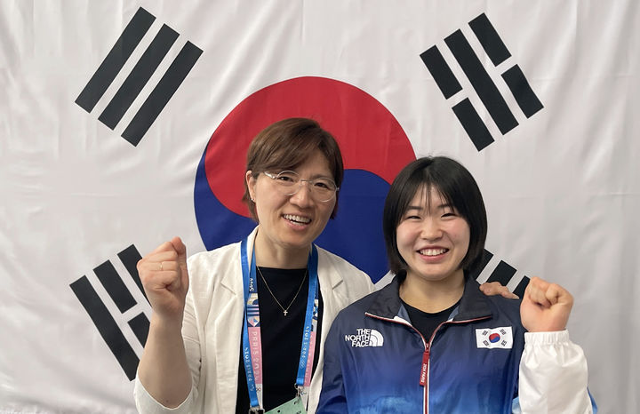[서울=뉴시스] 김금보 기자 = 장미란 문화체육관광부 제2차관이 30일(현지시간) 프랑스 파리 올림픽 선수촌을 방문해 여자 유도 57Kg급에서 은메달을 획득한 국가대표 허미미 선수를 격려하고 있다. (사진=문화체육관광부 제공) 2024.07.31. [email protected] *재판매 및 DB 금지