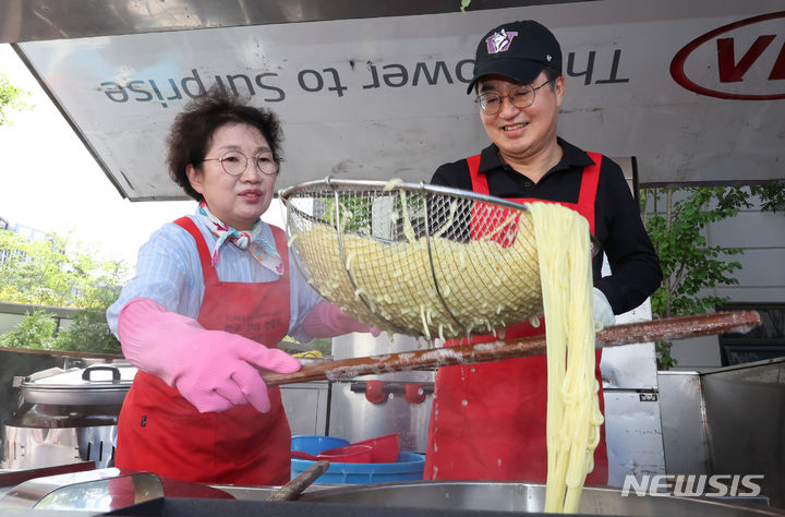[파주=뉴시스] 황준선 기자 = 김동연(오른쪽) 경기도지사와 부인 정우영 여사가 31일 오전 경기 파주시 한 아파트 단지에서 사랑의 짜장차 봉사활동에 참석해  2024.07.31. [email protected]
